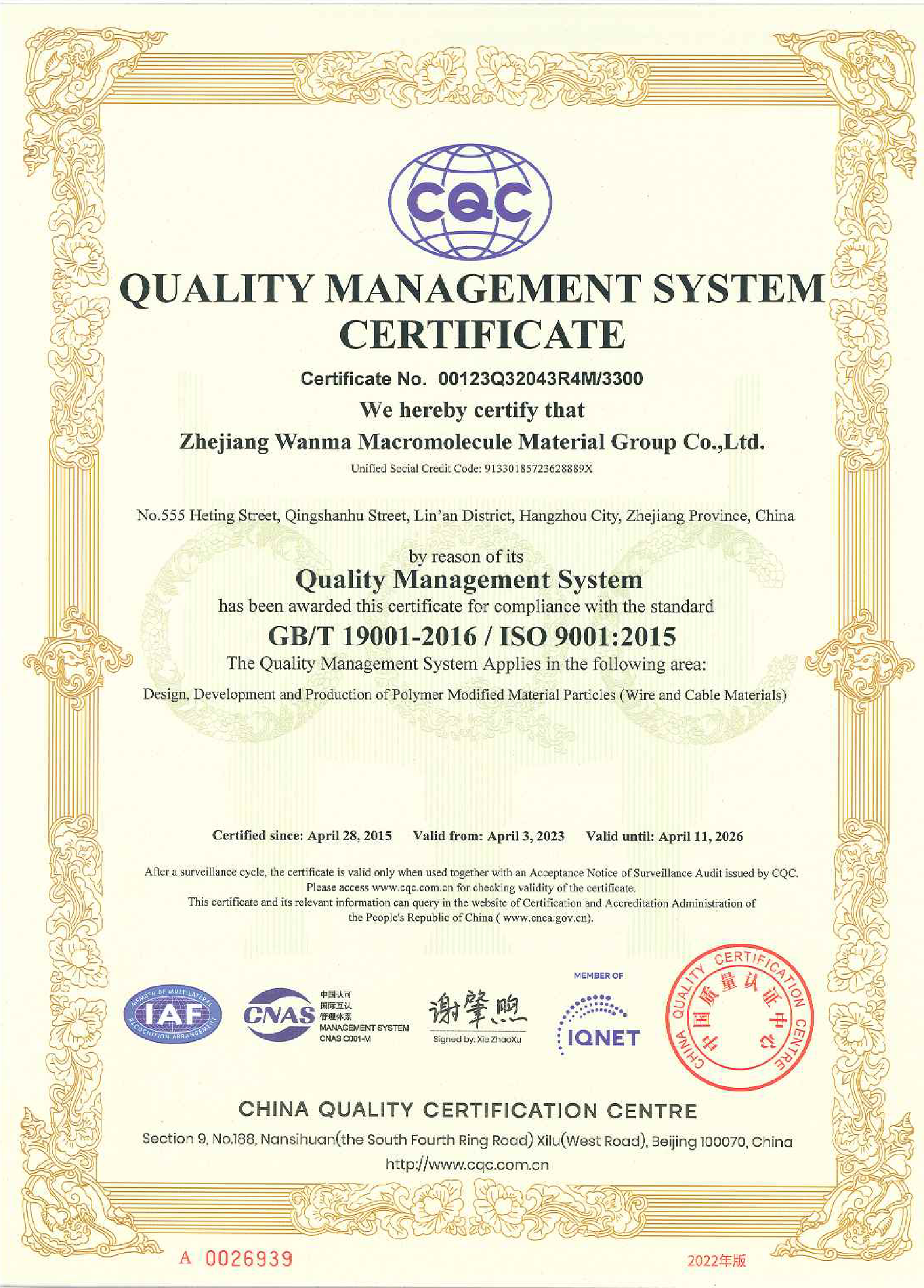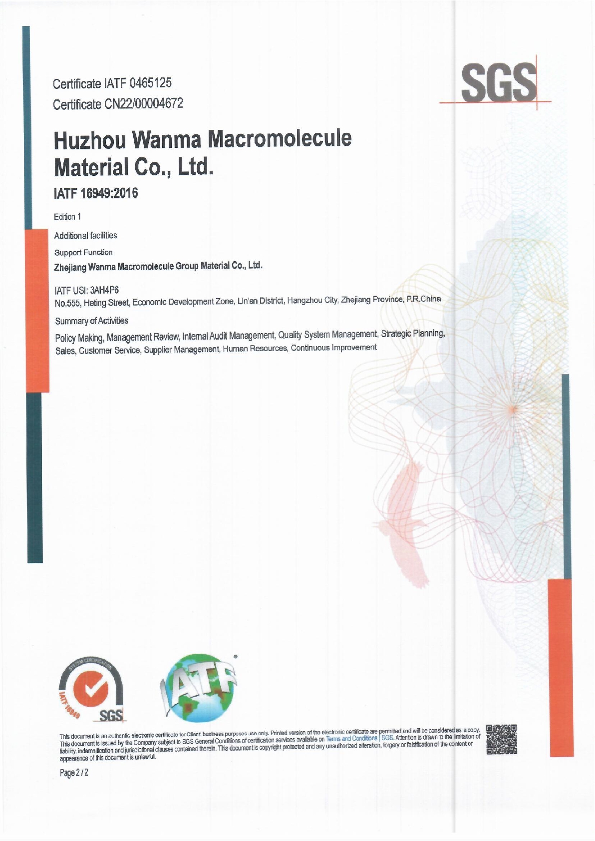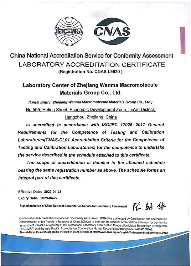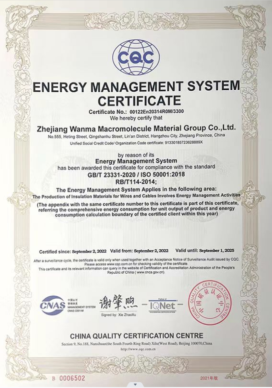 Wanma Macromolecule has always attached importance to quality management. The company has obtained IATF16949 certificate, ISO9001 quality management system certificate, ISO14001 environment management system certificate and ISO45001 health and safety management system certificate etc.