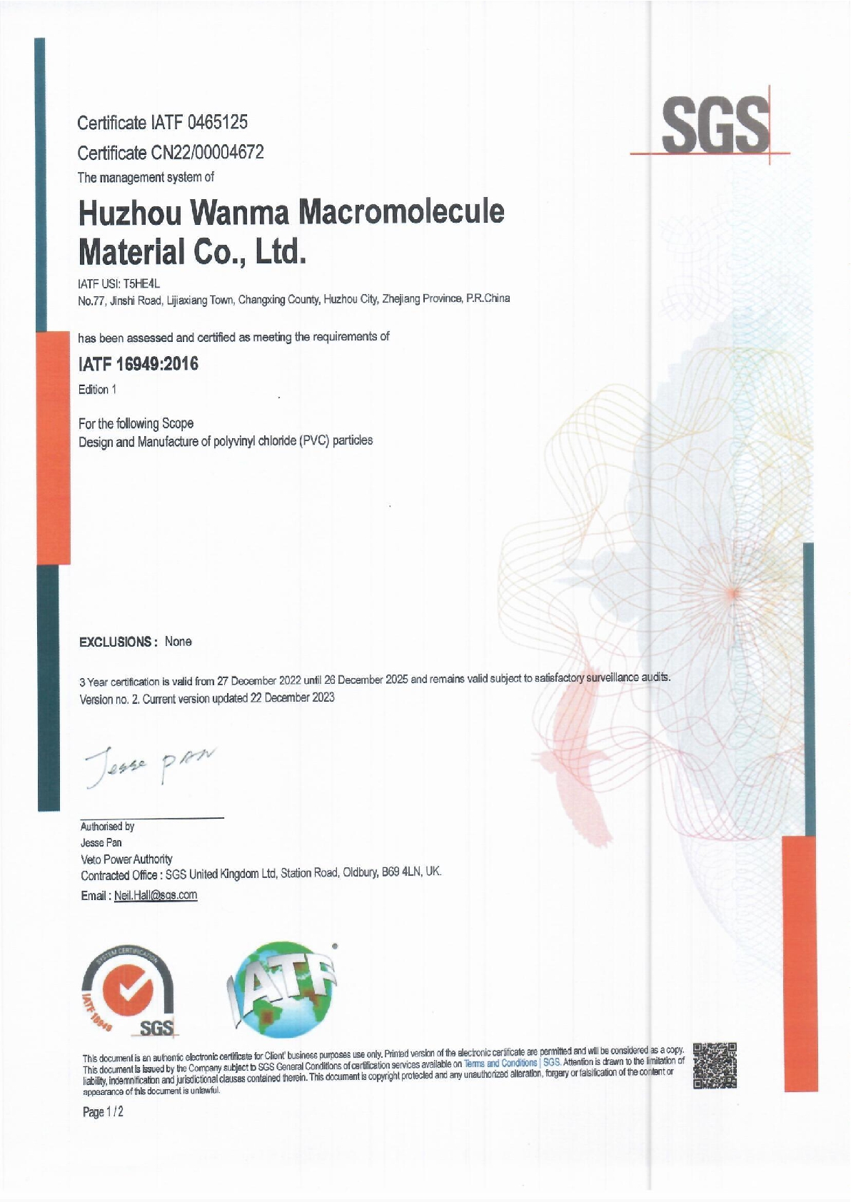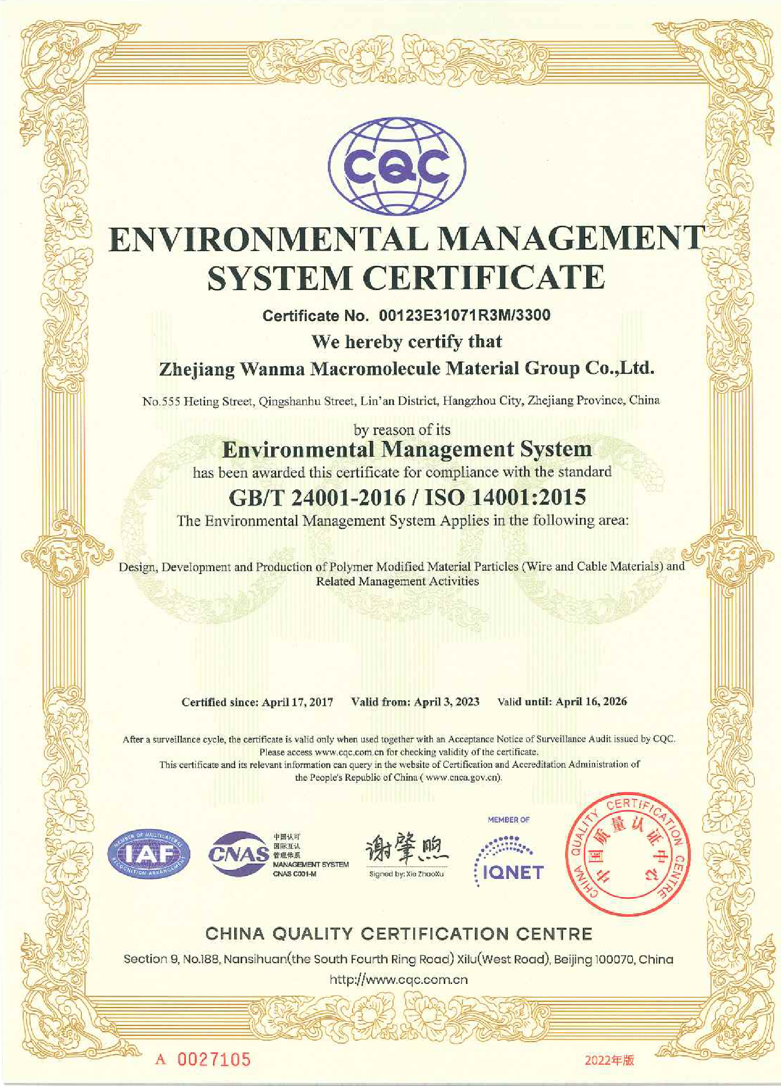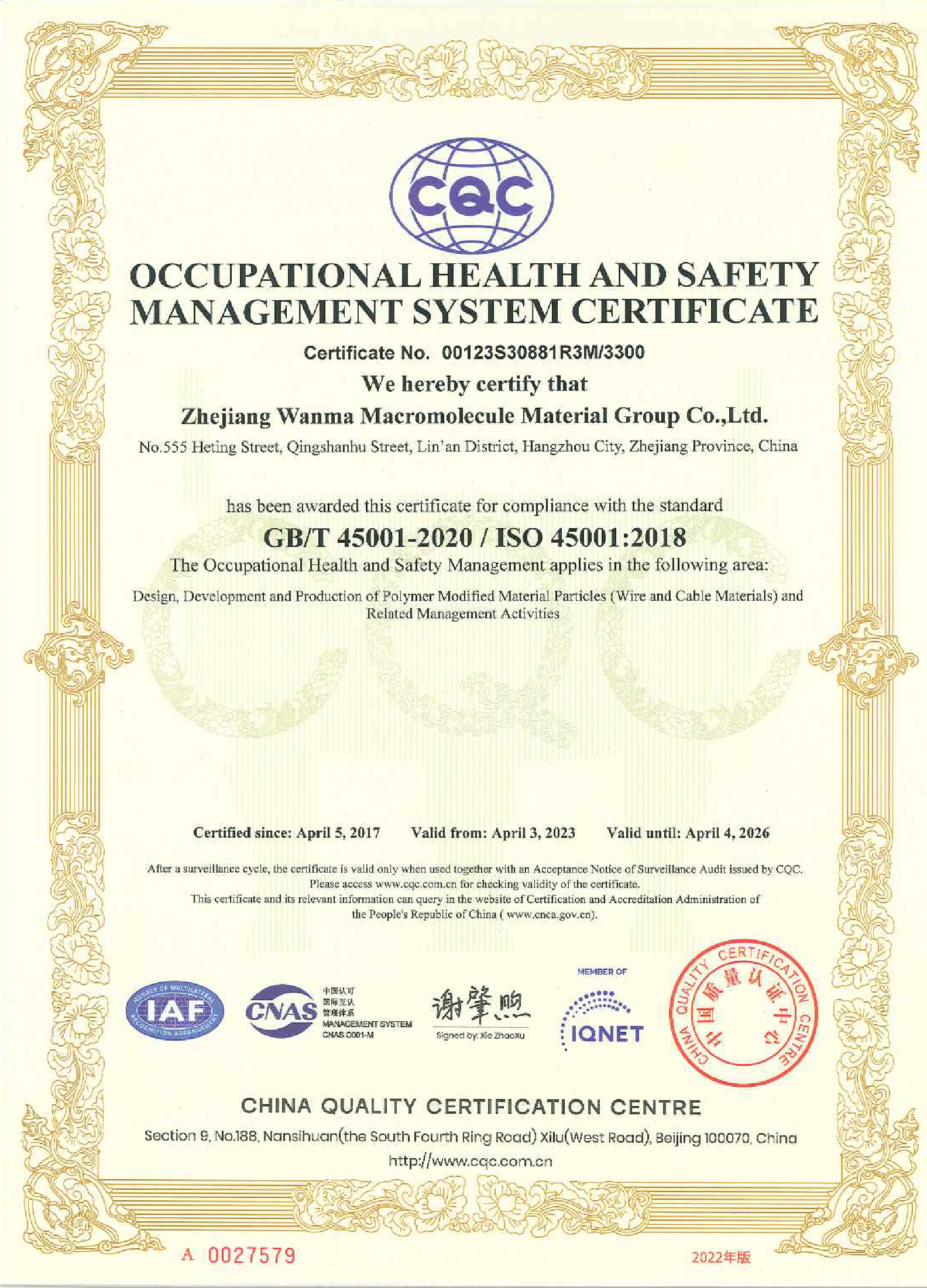 Wanma Macromolecule has always attached importance to quality management. The company has obtained IATF16949 certificate, ISO9001 quality management system certificate, ISO14001 environment management system certificate and ISO45001 health and safety management system certificate etc.